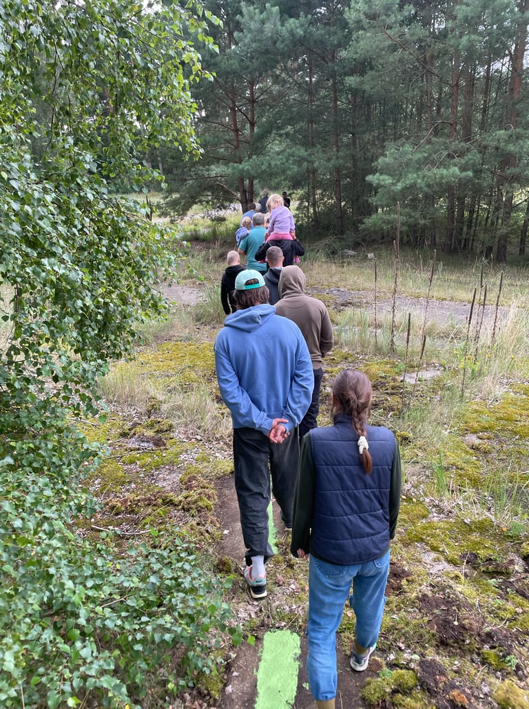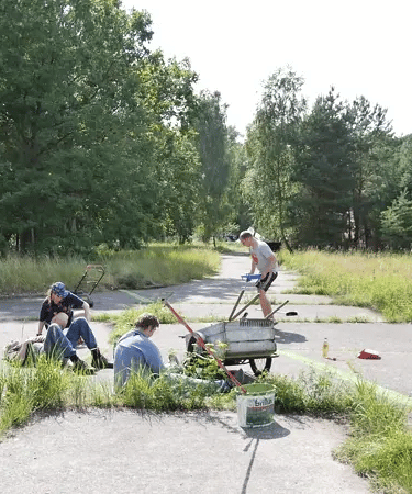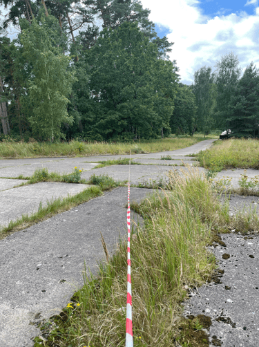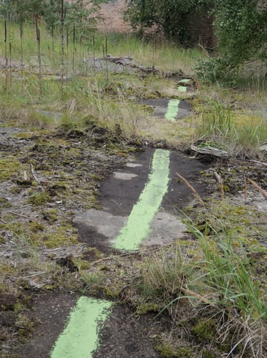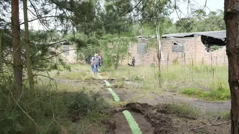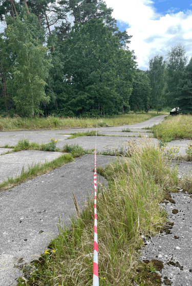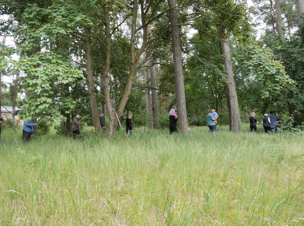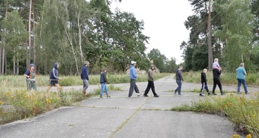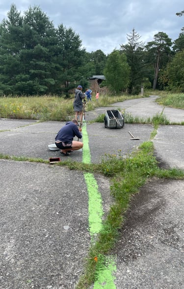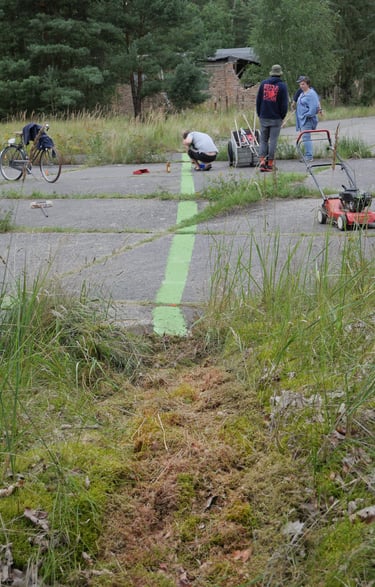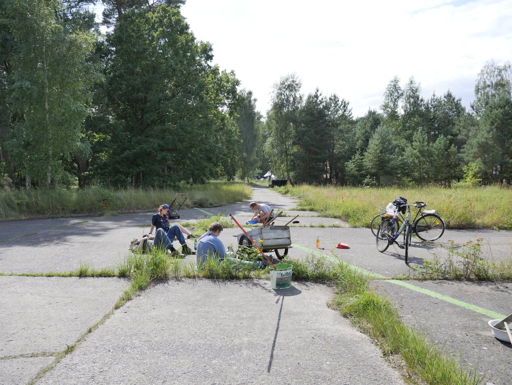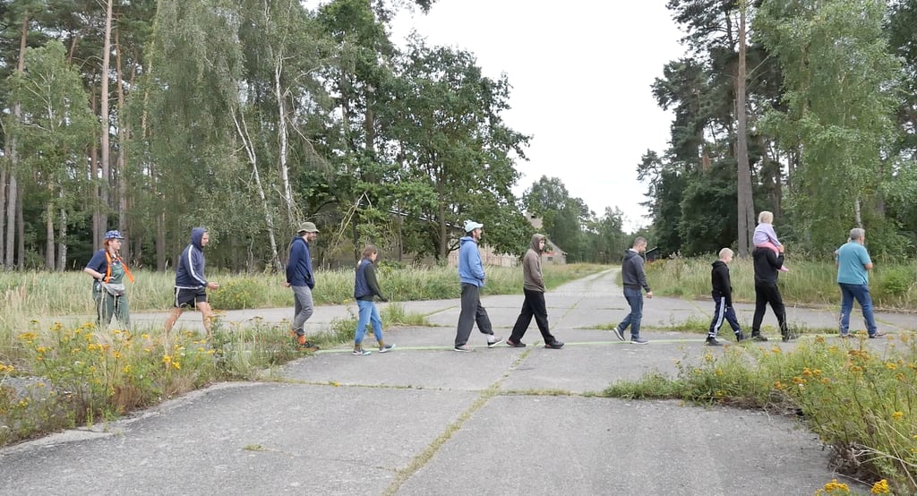 Im nordwestlichen Drittel des Geländes ist mit einem Abstand von 300 m vom Ufer des Stettiner Haffs der Küstenschutzwald ausgewiesen. Innerhalb dieser Grenze sind Waldumwandlungen nicht zulässig. Der Verlauf der Grenze ergibt sich einzig aus dem Versatz des Uferverlaufs und durchschneidet Wege, Gebäude und Naturraum gleichermaßen. Weil sich die maßgebende Referenzlinie in so großer Entfernung befindet, lässt sich der Verlauf der Grenze vor Ort nicht eindeutig nachvollziehen und nachempfinden. Um diese Grenze zu kommunizieren, haben wir einen Grenzbegang durchgeführt. Die Praxis des Grenzbegangs zur Klarstellung von Grenzverläufen reicht in der Kulturgeschichte weit zurück. Grenzbegänge waren in der Vergangenheit häufig Anlass für spezielle Riten, Zweck dieser Handlungen war die Aufrechterhaltung der Erinnerung an den Grenzbegang, insbesondere dort, wo Grenzen nicht durch natürliche Phänomene (Steine, besondere Bäume, Flussverläufe o. Ä.) sowieso sichtbar sind. Anschließend an diese Jahrhunderte alte Tradition des Grenzbegangs haben wir zusammen mit allen Menschen vor Ort eine gemeinsame Begehung der Grenze durchgeführt. Von der östlichen bis zur westlichen Mauer wurde das Gelände durchschritten, immer entlang und auf der Grenzlinie des Küstenschutzwaldes. Die Route führt durch verschiedene Waldzonen, auf Betonplatten, durch hüfthohes Gras, wird von Bäumen versperrt, die hügelige Erhebung der Bunkeranlagen hinauf und hinab und läuft dabei durchgehend unbeirrt von der sonstigen Raumlogik des Geländes. Der Begang, wenngleich eher soziale Praxis, die eine neue Route im Orientierungssinn der beteiligten Menschen verfestigt, hat auch einen direkten Einfluss auf den Raum selbst. Es bleiben Spuren zurück: Trampelfade durch den Wald, von Unterholz freigeräumte Abschnitte und nachträglich mit Farbe nachgezogene Fluchtlinien. So hat die legislative Grenze ihre Entsprechung im Raum und in der Erinnerung bekommen.