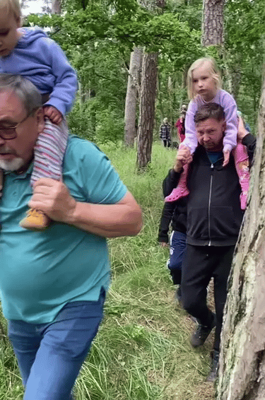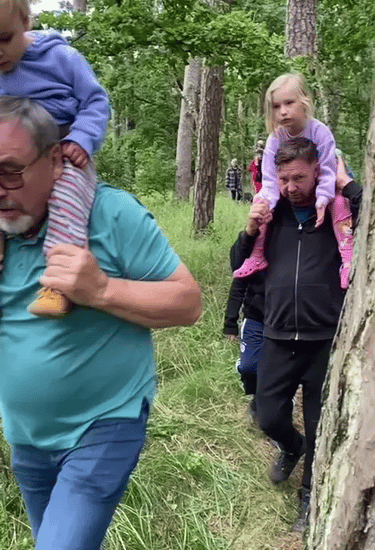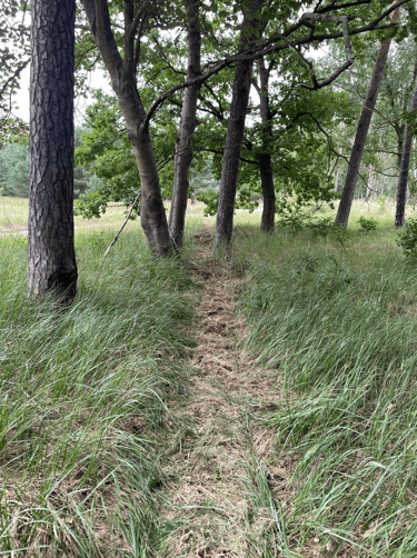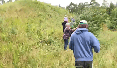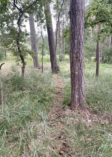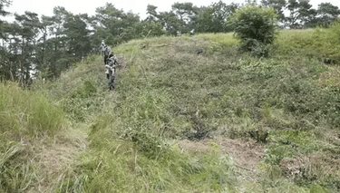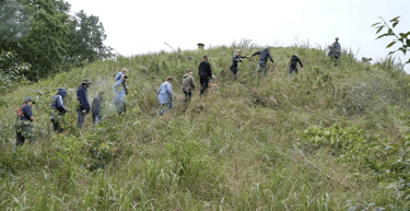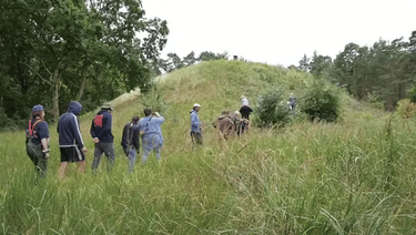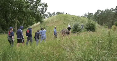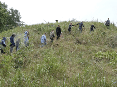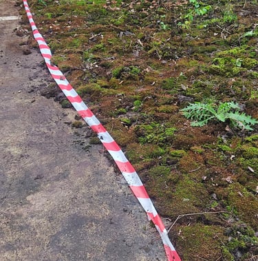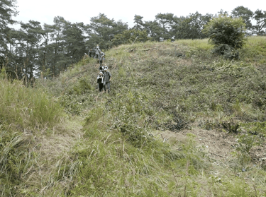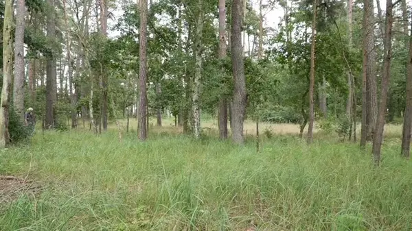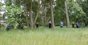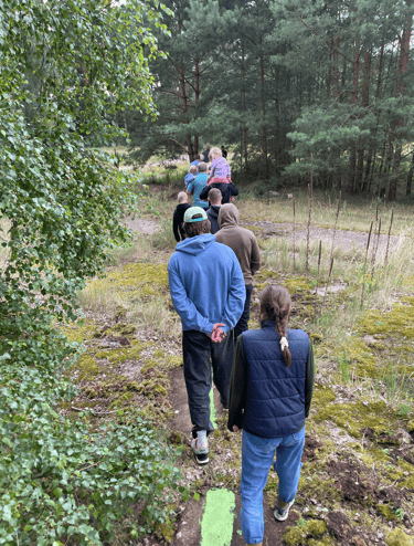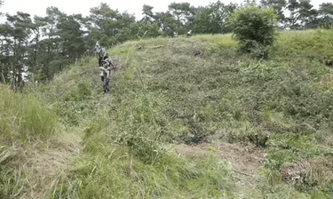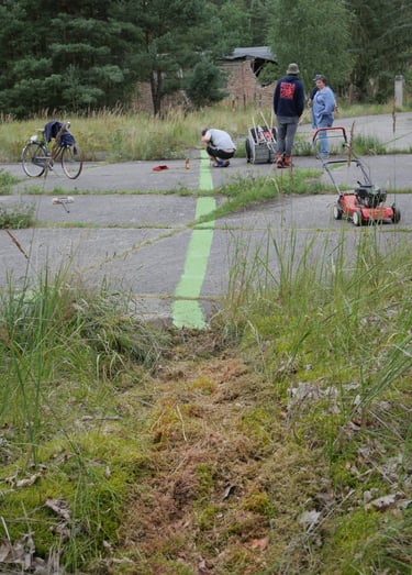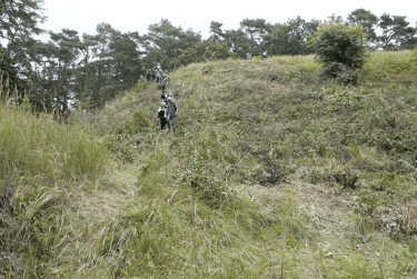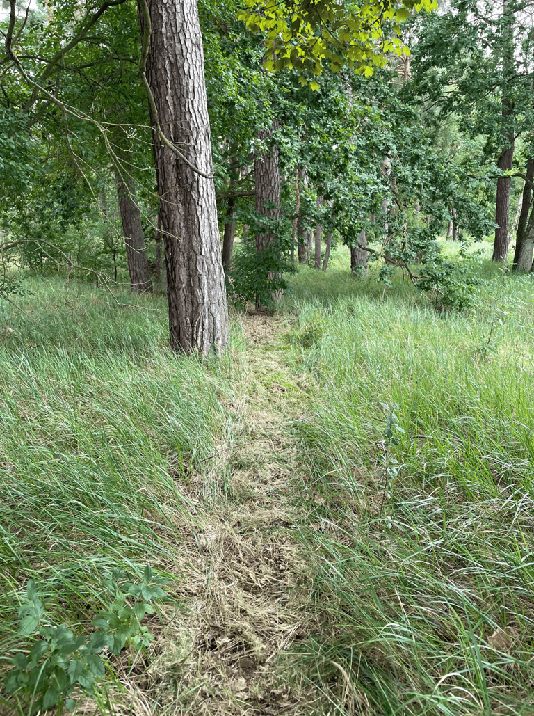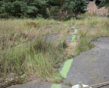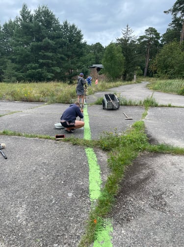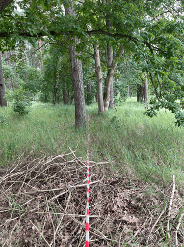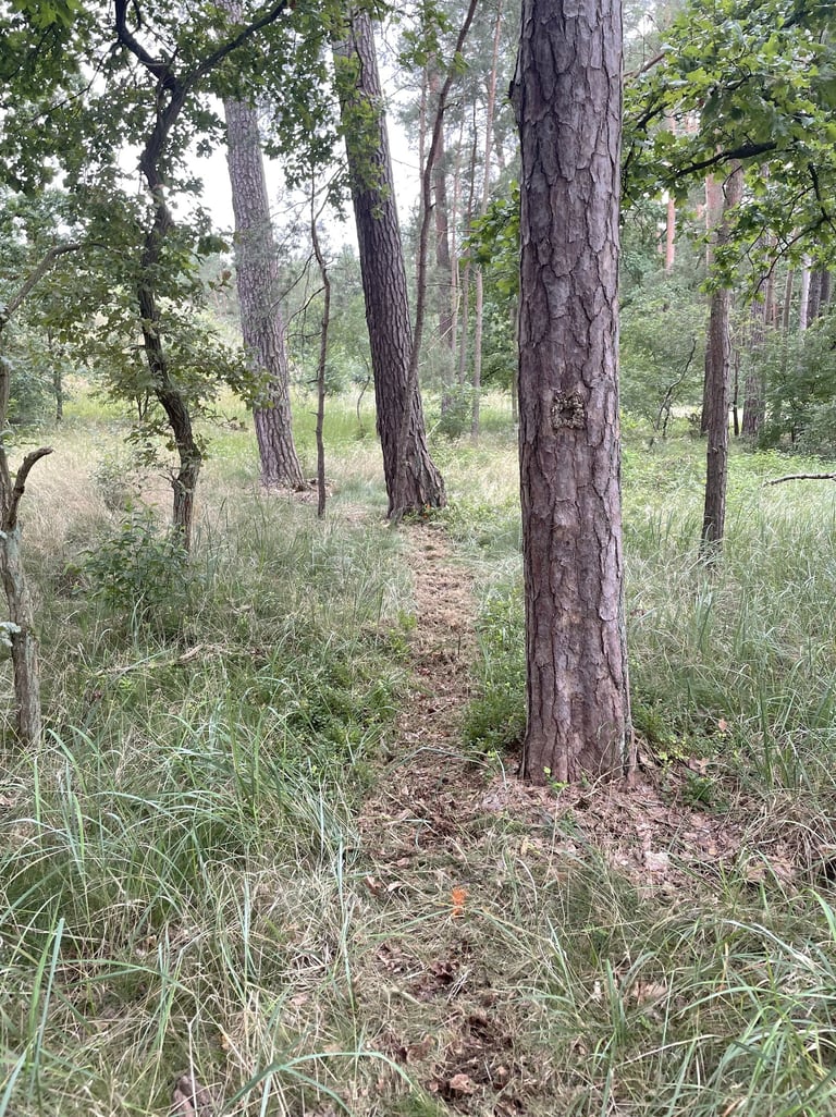 Im nordwestlichen Drittel des Geländes ist mit einem Abstand von 300 m vom Ufer des Stettiner Haffs der Küstenschutzwald ausgewiesen. Innerhalb dieser Grenze sind Waldumwandlungen nicht zulässig. Der Verlauf der Grenze ergibt sich einzig aus dem Versatz des Uferverlaufs und durchschneidet Wege, Gebäude und Naturraum gleichermaßen. Weil sich die maßgebende Referenzlinie in so großer Entfernung befindet, lässt sich der Verlauf der Grenze vor Ort nicht eindeutig nachvollziehen und nachempfinden. Um diese Grenze zu kommunizieren, haben wir einen Grenzbegang durchgeführt. Die Praxis des Grenzbegangs zur Klarstellung von Grenzverläufen reicht in der Kulturgeschichte weit zurück. Grenzbegänge waren in der Vergangenheit häufig Anlass für spezielle Riten, Zweck dieser Handlungen war die Aufrechterhaltung der Erinnerung an den Grenzbegang, insbesondere dort, wo Grenzen nicht durch natürliche Phänomene (Steine, besondere Bäume, Flussverläufe o. Ä.) sowieso sichtbar sind. Anschließend an diese Jahrhunderte alte Tradition des Grenzbegangs haben wir zusammen mit allen Menschen vor Ort eine gemeinsame Begehung der Grenze durchgeführt. Von der östlichen bis zur westlichen Mauer wurde das Gelände durchschritten, immer entlang und auf der Grenzlinie des Küstenschutzwaldes. Die Route führt durch verschiedene Waldzonen, auf Betonplatten, durch hüfthohes Gras, wird von Bäumen versperrt, die hügelige Erhebung der Bunkeranlagen hinauf und hinab und läuft dabei durchgehend unbeirrt von der sonstigen Raumlogik des Geländes. Der Begang, wenngleich eher soziale Praxis, die eine neue Route im Orientierungssinn der beteiligten Menschen verfestigt, hat auch einen direkten Einfluss auf den Raum selbst. Es bleiben Spuren zurück: Trampelfade durch den Wald, von Unterholz freigeräumte Abschnitte und nachträglich mit Farbe nachgezogene Fluchtlinien. So hat die legislative Grenze ihre Entsprechung im Raum und in der Erinnerung bekommen.