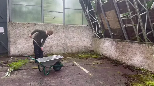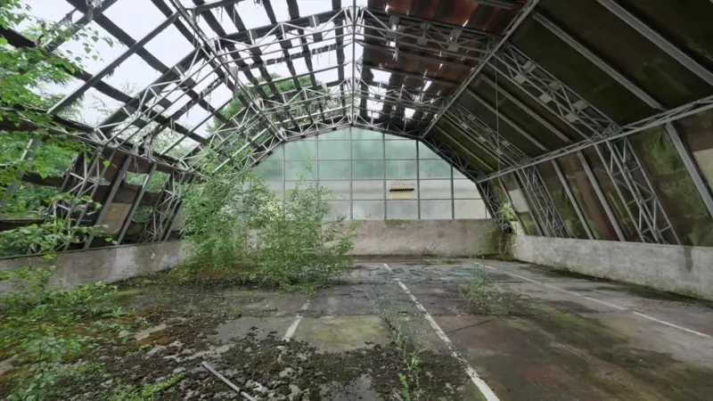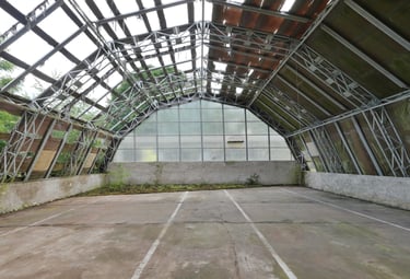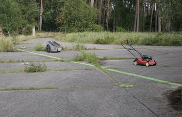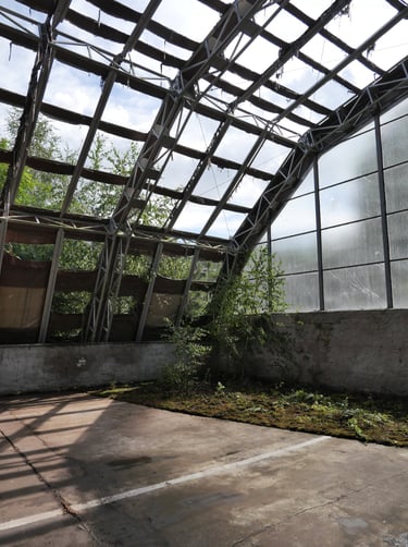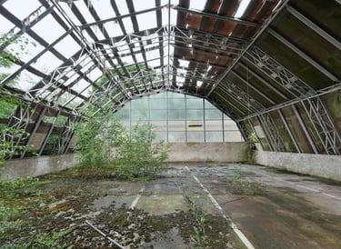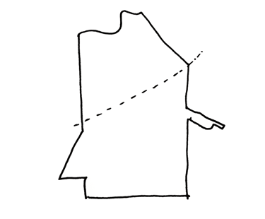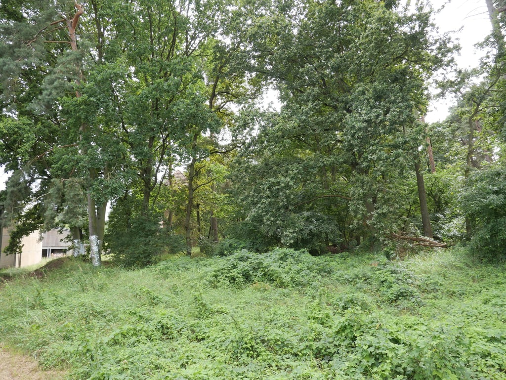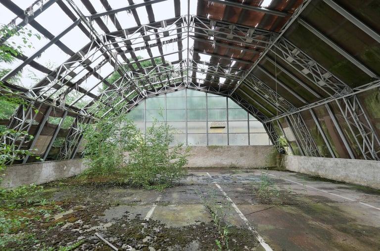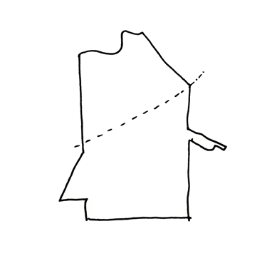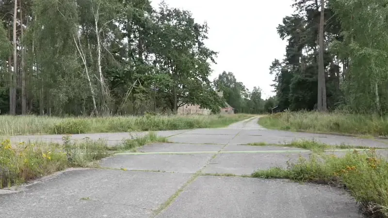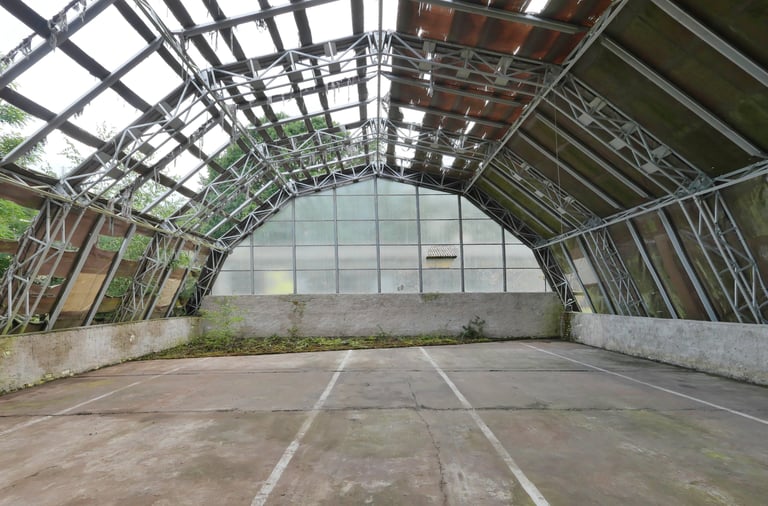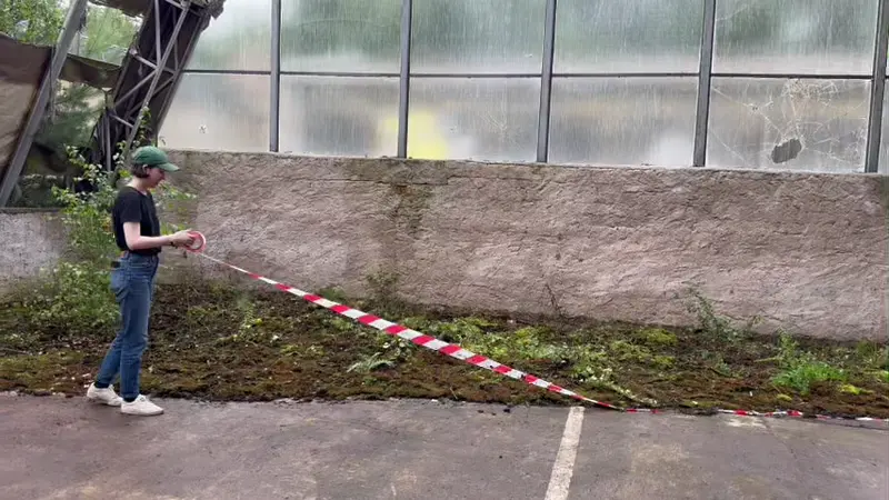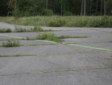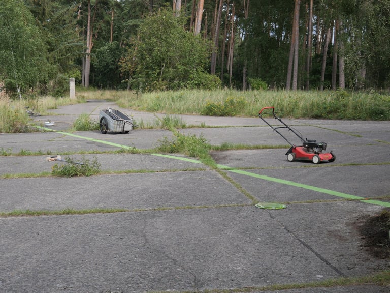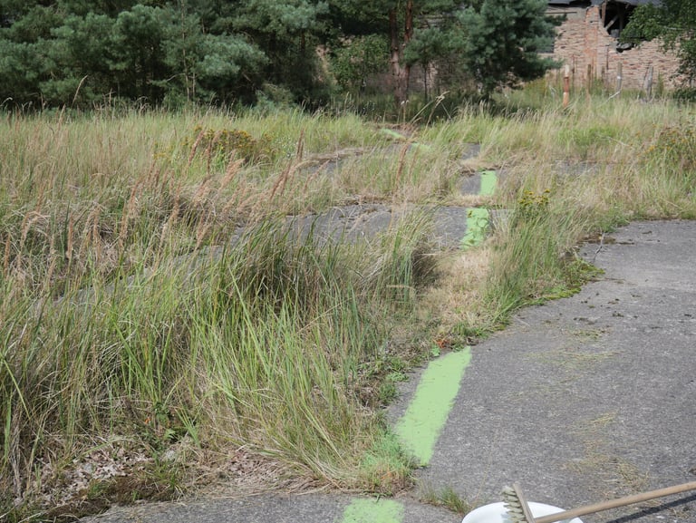 Die Halle 3 wird in ihrer südöstlichen Ecke diagonal durch einen leichten Kreisbogen geschnitten. Dieser Kreisbogen gehört zum 30-m-Waldabstand und markiert die Grenze von Natur- zu Kulturraum. Diese legislative Grenze entspricht vor Ort aber nicht den physischen Verhältnissen. Das Hallenbauwerk kragt seit Jahrzehnten schon in den erst kürzlich festgestellten Waldabstand hinein. Unabhängig davon hat sich die Natur ebenfalls den Weg ins Gebäude gebahnt, der Boden ist mit Humus, Moos und Pflanzen bedeckt, mehrere Birken wachsen zwischen den Betonplatten und Astwerk umliegender Bäume, Sträucher und Büsche ragt in die Halle. Weder Architektur noch Natur haben sich an die legislativen Zuschreibungen gehalten, noch von ihnen gewusst. Um jetzt die neuerdings eindeutig identifizierten und festgeschriebenen Zustände auf dem Gelände herzustellen, haben wir den Überlagerungszustand von Natur und Architektur aufgelöst und die Örtlichkeiten ihrer Bestimmung entsprechend aufgearbeitet. Der Betonboden der Halle ist überall von Pflanzen befreit und gereinigt, wo kein Wald existiert, dafür ist in der Gebäudeecke, die dem Wald zugehörig ist, ein Naturraum hergestellt worden. So ist ein den jüngst festgestellten Gesetzmäßigkeiten Folge leistender, geordneter Zustand hergestellt worden. Zudem wird durch die Intervention die legislative Grenze eindeutig abgebildet, um zukünftige Missverständnisse und Übertretungen zu vermeiden.