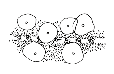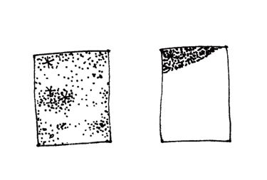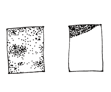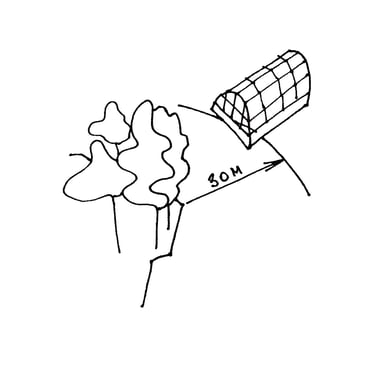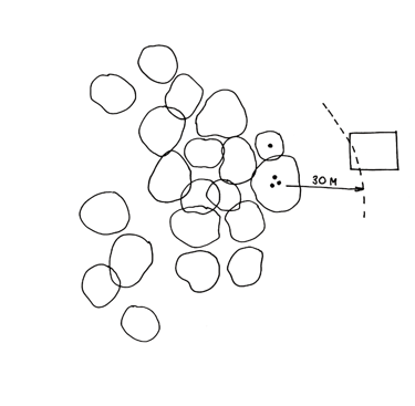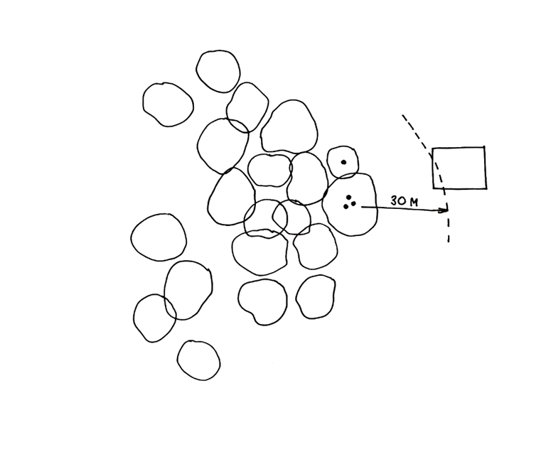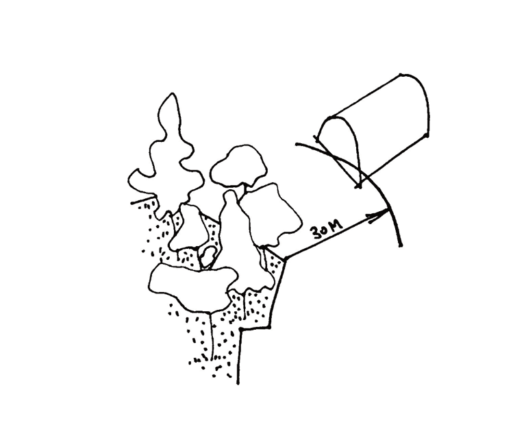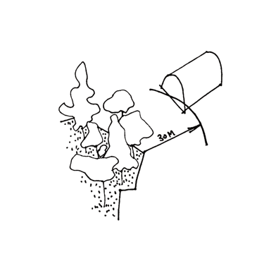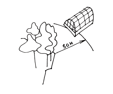 Die Hierarchien sind hier nicht eindeutig, was hat von was Abstand zu halten, die Gebäude vom Wald, der Wald von den Gebäuden? Stehen Bäume näher als 30 m von Architekturen, gefährden sie diese, könnten sie sie doch beim Kippen, Stürzen, Umschlagen beschädigen. Diese Bäume, die unabhängig von ihrem Wuchs und ihrer Art, also den kritischen Abstand zu Gebäuden, unabhängig von deren Konstruktion und Tektonik, nicht einhalten lassen sich identifizieren und markieren.