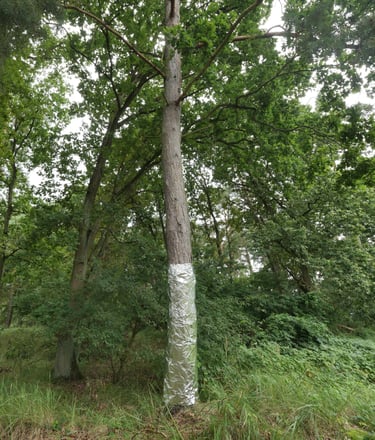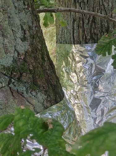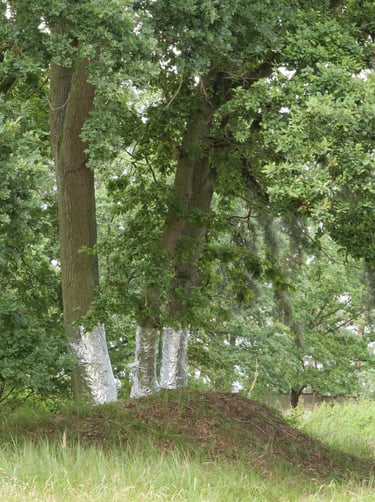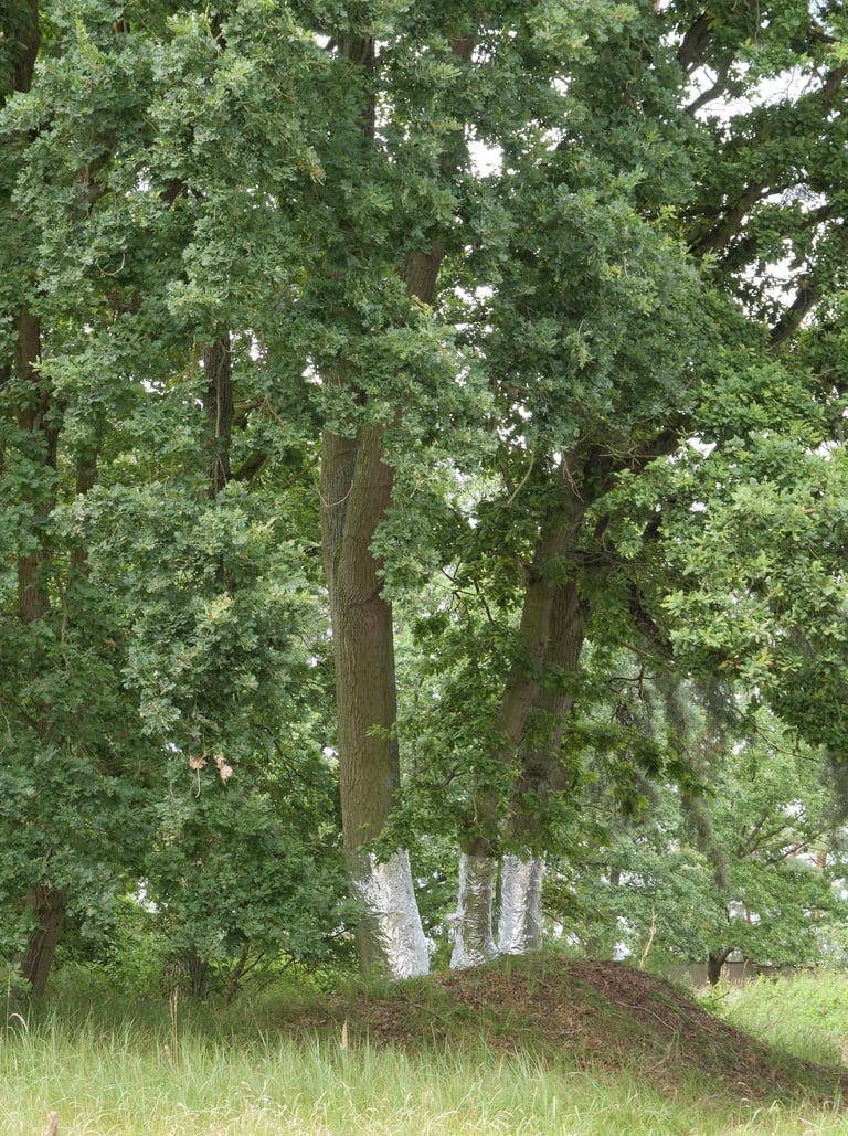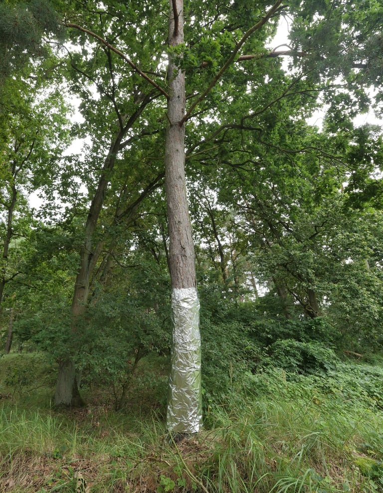 Die Markierung erfolgt am Stamm durch das Aufbringen einer silberglänzenden Haut. Das Material, dünn gewalztes Metall, entspringt einer technischen Logik. So bekleidet rücken die Bäume zwar nicht räumlich, doch aber ästhetisch näher an die technischen Bauwerke der alten Kaserne. Sie sind ausgezeichnet als kulturell überformte Artefakte und sollen so dem Bedeutungskosmos der wildgewachsenen Natur entnommen werden. So angeeignet, überformt und in die Künstlichkeit überführt, können die Stämme keine Gefahr mehr für die Architektur sein, der sie nun angehören.